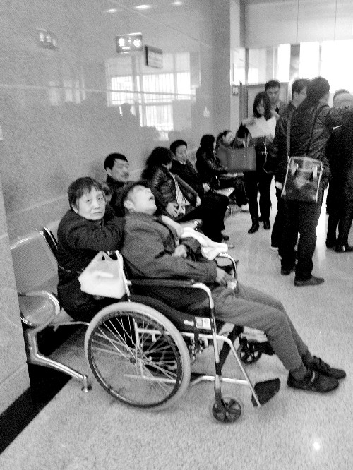 伸长着腿,身子尽可能地往后倾……74岁的郑州老人牧先生僵坐在轮椅上。为了防止他跌倒,他的老伴不得不一动不动地坐在他的后面,把手搭在他的肩膀上。