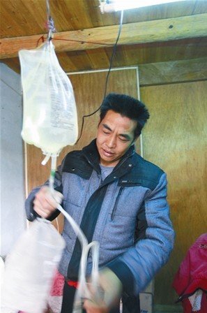 2000年,胡啊发被确诊为尿毒症。为了给家里人减轻负担,胡啊发决定放弃在医院做血液透析,而是回家自己用药进行腹膜透析。但即便这种“自助式”的治疗,每天也要花去近200元,一个月下来就是6000元。再加上每年固定去杭州治疗4次,一年下来的医药费也将近10万元。