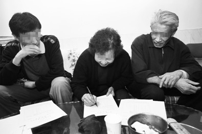 昨日,强子与家人在调解书上签字。此前,因数度入狱,强子获释后不被父母接纳,一气之下将父母告上法院。新京报实习生 翟超 摄