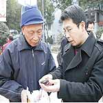 在鸢都社区活动室,社区工作人员正在为老年人免费发放手机。75岁的孙洪亮拿着新发放的手机,一边端详听着工作人员介绍手机的详细功能。孙洪亮告诉记者,家里只有他和老伴两人,有了这个手机遇到急事儿就能派上用场。