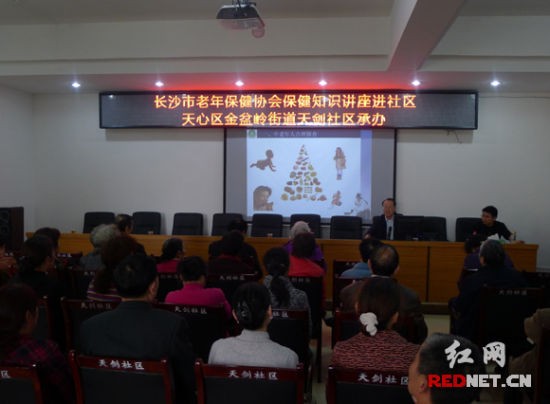 (由长沙市老年保健协会主办的保健知识讲座进社区公益活动在天心区金盆岭街道天剑社区启动。)