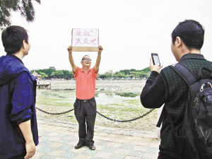 身穿红色T恤,戴着防晒眼镜,虽年近60岁的老杨的心态却非常年轻。“愚人节和大家开个玩笑,觉得挺有趣。”老杨告诉记者,他这么做并不是真的想找个男友,只是觉得现代人压力太大了,有时候也太严肃了,所以想开个玩笑。记者观察到,不仅龙舟池畔的游客被逗开心了,面对丈夫这一“出格”行为,老杨的老婆也被逗乐了。