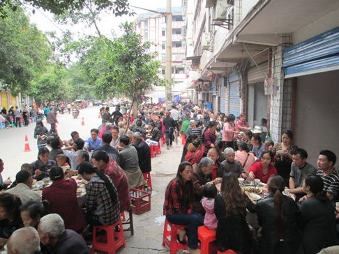 “已是五世同堂了。我婆婆的子子孙孙加在一起近50人。”据练小红介绍,之所把办寿宴的地点定在安居古镇,有两个原因。一是因为这里是风景优美、交通方便,街道地势宽绰,宾客们来了,有地方玩,有风景看。二是因为老寿星的大子儿长年居住在这里,知道这里民风淳朴,街坊邻居都很热情好客。