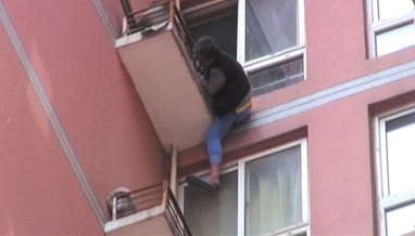 老汉双手攥住平台栏杆,但身体却在不停扭动,突然整个身子悬在半空中,脚上的拖鞋也摇摇欲坠,不少围观居民惊慌地大叫。约1分钟后,老人用力将一条腿跷到护栏上,但无力将整个身体爬上平台,紧靠一只手臂和一条腿卡住阳台护栏。此时,老人似乎才回过神来,不停大喊救命,两名消防员和一名民警立即冲上12楼。