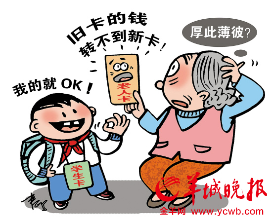 “学生卡的钱可以转,为什么老人卡就不行?每年丢失的老人卡不少,卡里的钱都到哪里去了?”街坊于大姐刚充值的老人优待卡(半价)近日被盗,补办新卡后,失卡的余额却不能转到新卡中,这让她很不解。