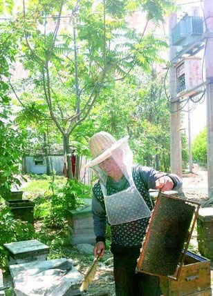 养蜂人老申今年58岁,此前他的蜜蜂在安徽安庆市采油菜花蜜,根据花期需要,10天前,由安庆市来到临清市采槐花蜜。因放蜂需要,一大早老申就起床拾掇蜂蜜。