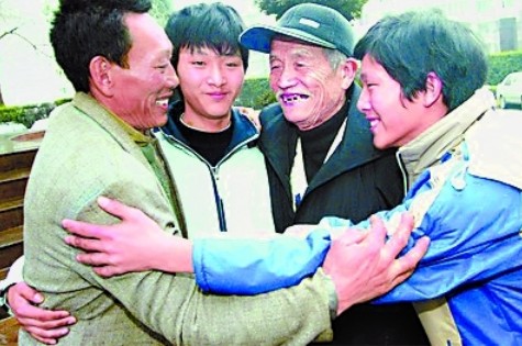 2006年1月16日,四川渠县,团圆的蒋川父子与宋爷爷拥抱在一起
