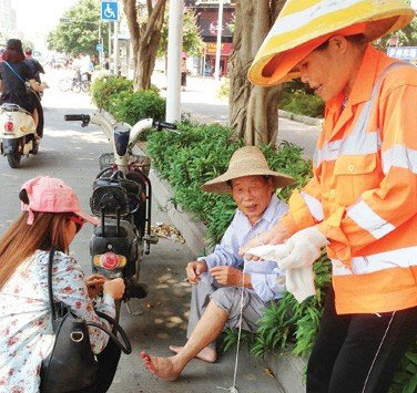 这是一个炎热的午后,一辆辆两轮车取道慢车道,从坐着的老人旁边经过。脚上的血在流,路上的车在走,如此下去势必增加道路拥堵和老人的危险。突然,环卫工问:“用我的口罩行不行?”她立即脱下自己的口罩,撕扯成布条。