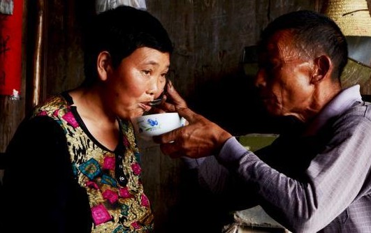 图为妻子杨胜秀患病偏瘫后,陈永桃每天给她喂药,照顾她的起居饮食。 李胜成 摄