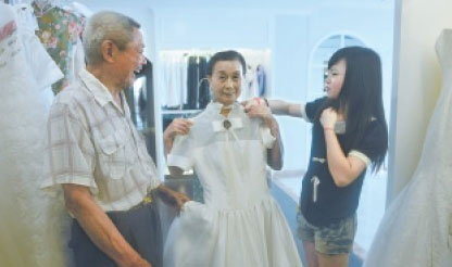 而就在喻家翠老人化妆的时候,另一对老夫妻许国武和黄家华已经在挑选婚纱和礼服。81岁的许国武提前穿好了黑色的中山装,精神抖擞地站在试衣间前。当他的老伴,今年80岁的黄家华穿着白色婚纱,从试衣间里出来的时候,许老明显愣了半天,随后喃喃自语道:“太漂亮了,差点没认出来。”