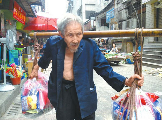 系绳,挽绳,上棒棒,挑起……甘在思驾轻就熟地把两大包货物挑上了瘦弱的肩,一路上,虽然佝偻着背,但是老人没有歇息一下。交货,开单,领钱……甘在思来到网吧的前台,和管理人员交接了货物,清点了货款之后,把货款小心翼翼地放进了裤袋里,并用手捂着。在回程的一路上,老人始终紧紧地把手贴在裤袋边上,生怕出事。