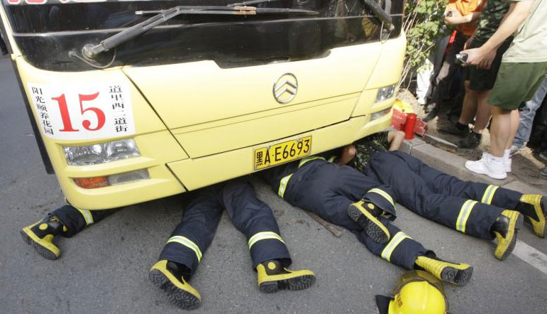 参加营救的消防战士,钻到公交车下不断安慰老人“马上救您出去,您再坚持一下。”