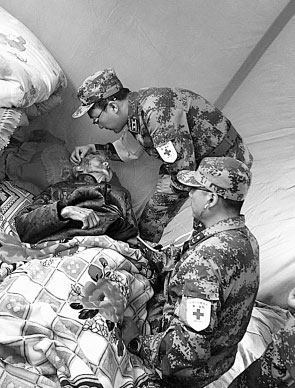 7月24日,解放军第一医院抗震救灾医疗巡诊队步行至拉路村安置点时,季月桃仍躺在床上紧闭着双眼。由于被掩埋时间太长,老人头部严重受伤,至今仍处于晕迷状态,滴水不进。