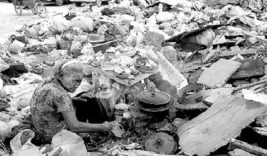 在老人的对面,一片垃圾堆成了一座小山,十分醒目。上面堆放着饮料瓶、木板、编织袋、纸箱,旁边的一张席子上晒着从路边小吃摊上捡来的鸡心、猪肝等食品,这些食品早已变质,但老人还当成好菜,吃得很香。