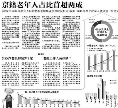 老龄办发布《2012年老年人口信息和老龄事业发展状况报告》。该《报告》显示,截至2012年底,全市60岁及以上户籍老年人口占总人口的比重首次超过两成。