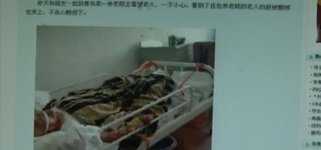 今年9月12日,青岛网络电视台刊播青岛某养老院一位老人四肢被“绑”床上的报道,引起很多网友关注,视频中老人手脚都绑着红布条,另外一端则拴在床杆上,老人鼻子里还插着导管。专业养护人员称这是对
