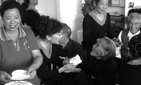 夕阳红老年公寓工作人员在为老人分蛋糕。