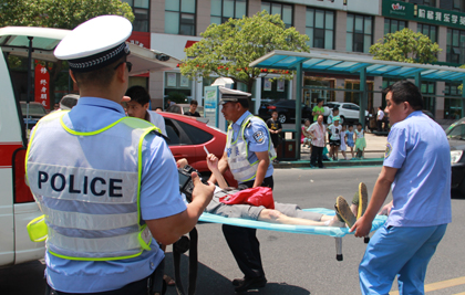 昨日上午有市民向本报反映,称在松江路公交车站附近,一名老人被疾行出租车撞倒,伏地呻吟,哀号不止。记者来到事发现场时,120救护人员正将呻吟的老人抬上救护车。