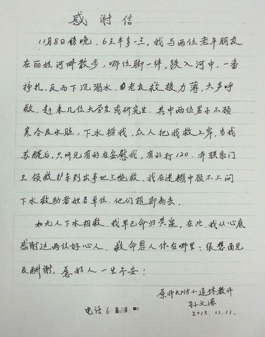 写感谢信的老人名叫孙义源,今年75岁,是华东师大附属小学的退休语文教师。11月9日18时许,他和两名老年朋友正在丽娃河边散步,不慎掉入丽娃河中。落水老人不停地挣扎,但仍迅速下沉。两位路过的男同学见状先后跳进河水中合力将老人救出。