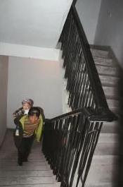 记者帮助方女士提手中的物品,跟随她从楼梯步行上楼。上楼期间,记者遇到了不少住户上下楼。从底楼到家里,方女士休息了3次,用了15分钟才将有近500级楼梯走完。到达家里时,她表示明显感到后背流汗,比较累。