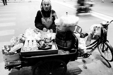 夏天老人会亲自蹬着三轮车跑到几十里之外的批发市场购买一些哈密瓜,切成细条卖;冬天老人就会卖煮玉米等小东西。一天收成好的时候能挣上几十元钱,她就很满足了。无论刮风下雨,还是阴晴雨雪,只要身体允许,她都会坚持出来摆摊,深夜才独自骑车返家。