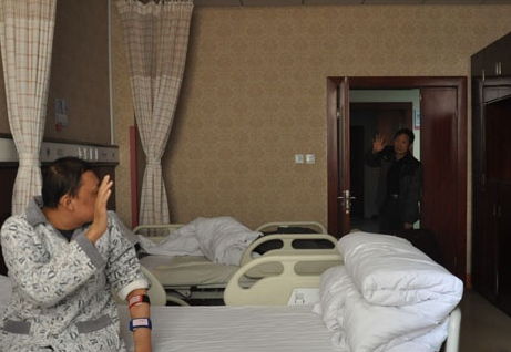 这天上午,我们一起来到了郑州市人民医院颐和医院。中午12点,老人见到了做完血液透析的儿子,但把衣物和善款交给儿子后, 他便强忍着泪水匆匆离开。离别时,老人和儿子的眼中都闪烁着泪花。在医院的走廊里,薛荣贵老人越走越快,眼泪哗哗地下来了,他说:“不是我狠心要留下他一个人,我必须回家挣钱,一天都不能拖。”