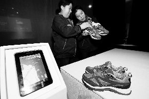 昨天,北京服装学院服饰时尚设计产业创新园展厅内,两名观众在仔细研究“在哪”智能鞋的神奇之处,旁边的电脑屏幕上显示着台上这双鞋的GPS定位。