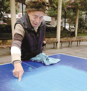 张大爷说,今年初,他看到乒乓球台被人砸出了洞,就找材料把它补起了。