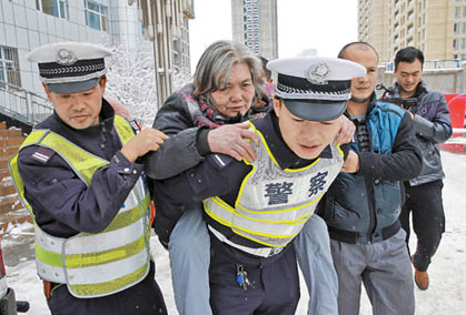 随后,张世兵和同事们帮老人找来了一条外裤给她穿上。老人的双腿冻得已无法行走,张世兵干脆背起了老人,用警车将其送回了家中。