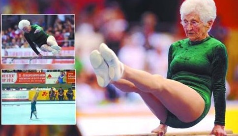 如果不是花白的头发和鼻梁上的老花镜显露了她的年龄,人们很难想象这位体操高手已有86岁高龄。据英国报道,—位86岁高龄的德国老奶奶成为2012年体操世界杯德国站比赛上的明星。虽然她满头白发,但她在表演中所呈现的体操动作依然灵活轻巧,给现场观众留下了深刻的印象。