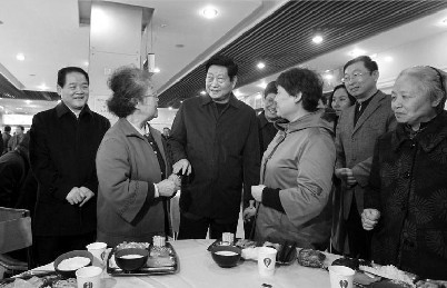 在大唐社区,赵正永说:“居家养老最重要的就是解决吃饭的问题。我们现在正在推一个就是社区小厨房,我们省市现在都拿钱把食堂办好,办好以后,让老人可以早中晚吃个饭,然后自己住在家里。下一步,我们还要下力气抓。社区的卫生所、卫生院要和服务的对象建立一个契约关系。医生要专门负责10个人,每次都要和这十个人联系,将来这个要在社区里推开。”在与社区专职工作人员亲切交谈时,听到他们对服务信息、业务流程如数家珍,赵正永十分高兴,勉励大家勤勉工作、搞好服务,在平凡岗位实现人生梦想。