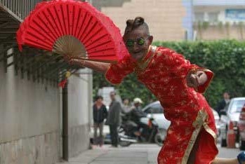 上个星期天早上8点半,江岸小区农贸市场内一名乞丐正坐在门口放着音乐乞讨。当李大爷戴着墨镜、穿着女士运动服、扎着辫子,手拿一把红扇子经过乞丐身边时,一些老邻居起哄说:“老美女,你来跳个舞嘛。”李大爷二话不说“哗”地打开扇子,和着音乐扭了起来。一时间,吸引了提着菜篮子的大妈、骑着三轮车的菜贩,或站、或靠围成了一圈。李大爷见人多更是开心地舞动着。