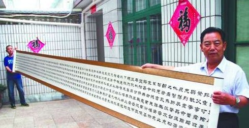 从临摹字帖开始,平度市民高焕军开始了自己的书法之路,30多年来,他坚持每天练字。近期他写成了28米的隶书长卷《千字文》,希望能将博大精深的中国文化传承下去。高焕军表示,书法给他的老年生活带来了乐趣,希望退休后能义务教更多的孩子学习书法,传承文化。