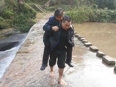 农历十月末,綦江的冬天还未正式到来,河里的水却已经寒意十足,背着体重显然超过自己的老人,喻伟显得有些吃力。他一步一步小心翼翼的落脚,汗珠一颗一颗的从涨的通红的脸上滑下。10多米的河道,平常只要几分钟就可以通过,这次却花了十多分钟。成功将老人送过河后,两位年轻人才急忙赶回单位。刚跑过河岸,对面传来老人的喊声:“好小伙,谢谢你们!”