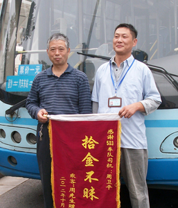 昨天,72岁的市民王金辉大爷在儿子和儿媳陪同下来到公交车队,将一面写有“拾金不昧 时代光辉”的锦旗送到车队管理人员手上,感谢车队和驾驶员高闯将其乘车时丢失的装有3000多元现金书包妥善保管并及时归还。