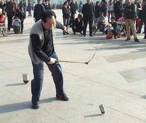 11月30日,登封市南环路月季园内,八旬老人崔大星正在兴致勃勃地与玩伴们玩“陀螺”大战。他们挥舞着鞭子,带动地上的陀螺飞旋,引得公园内的男女老少前来围观。