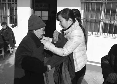 “大娘,你今年多大了?”志愿者“兰子”一边给一个老大娘系扣子一边问。“98岁了。”老大娘回答。“你穿上这件衣服真漂亮!”“兰子”夸奖道。但是这个老大娘好像没有听懂。“大娘,人家夸你长得好。”一名敬老院的工作人员上前解释。听了这话,老大娘脸上露出了腼腆的笑容,旁边的志愿者和工作人员也笑成了一片。