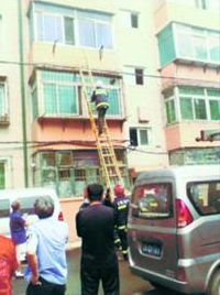 “后来我们就从邻居那里借来一个短梯子,把梯子架在单元门上的小平台上,平台比较窄,当时我只能从楼道窗户直接爬到梯子上,然后从梯子上抓住三楼的防盗窗。”