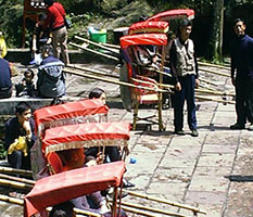 据了解,很多顾客在轿子停放处咨询,正在休息的轿夫们热情地介绍起来。据了解,这些轿夫的生意很不错,而光顾的多是一些年轻人。然而,形成鲜明对比的是,抬轿的轿夫却多为年纪大的,年纪最轻的也要接近50岁,其中就有50多岁的妇女。年龄最大的轿夫竟然是一位81岁的老人。一位年纪接近60岁的轿夫告诉记者,抬轿上山的确辛苦,尤其是大热天的,一个来回身上穿的衣服几乎全湿透。但由于收入不错,他们吃苦也习惯了,这份苦差年轻人肯定不愿意做的。