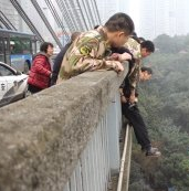 正面对老人一步步退后的消防员李宝石就在那一瞬间,疾步跑几步一个猛扑,一把扯住老人空中挥舞的一只手。随后赶到的其他消防员则从桥护栏中间的缝隙伸出去,一把扯住老人的裤子,有的扯住了上衣,紧紧抓住悬空的老人。