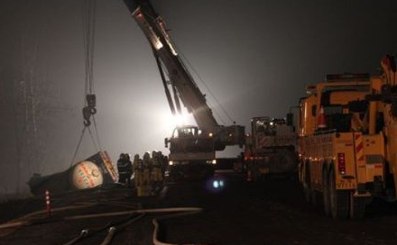 为尽快将槽罐车转移到安全地带,救援人员立即调集两辆大型吊车和一辆拖车来到现场。晚上7点10分左右,交警部门对该路段实施封闭,吊车慢慢地将槽罐车吊到路上。一个多小时后,槽罐车被成功放置到拖车上,在消防官兵的护送下,被送往涡阳县的一化工厂进行处置。