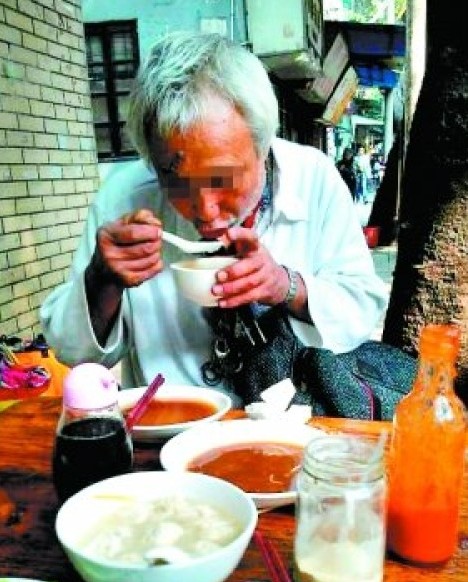 这时,张先生站起来说了一句,“很多人在排队,我买一份面给你吃吧。”没想到老伯也站了起来,走到人群中拉了一下他的手,嘴里说了几句话。在朋友翻译下,他才明白老伯在说什么,“老人大体在说自己不乞讨,吃剩饭只是觉得浪费可惜。”