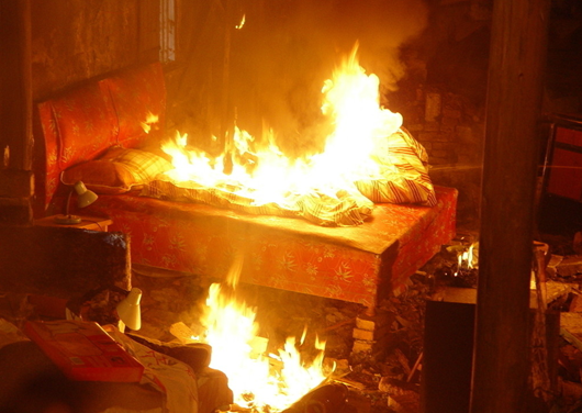 因一时想不通,苏某便决定“带着”自家的房子一死了之。于是苏某将自己事前购买存放的打谷机用的柴油,泼洒在自己卧室内的被褥上,并用打火机点燃,并坐在屋内任火势蔓延,直到房子引燃后,火势越来越大。
