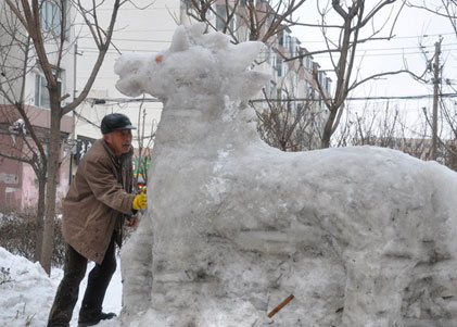 10日,吉林省吉林市,66岁的张大爷在吉林市青岛街庆丰小区内制作2米高的雪雕马。