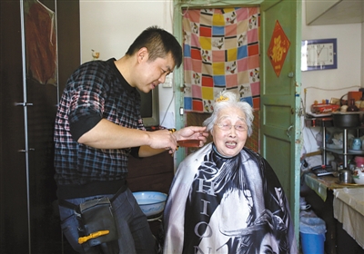 在东城区板厂南里社区一家8平方米的便民理发屋里,刘青春有着多个角色——老板、理发师、洗发小工。而在居民的心中,他不仅是理发师,还扮演着电工、门卫,甚至亲人的角色。