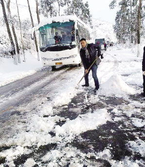 前天,云南昆明、曲靖、丽江、大理等下雪,造成多处道路结冰。昨日,到云南旅游的重庆游客刘先生发了一条微博,称他们一车20名重庆人堵在大理的路上,接近一天一夜时间。车外0℃,车上没有棉被,仅有少量食物和水,10米车厢内上演了不少感人的互帮互助故事。