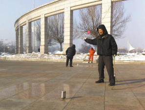 12月17日上午,四平市天气晴朗,室外仍让人感到寒冷。然而,寒冷的空气并没有阻挡人们锻炼的热情。在英雄广场内,3名老人正在锻炼身体,他们的锻炼工具吸引了不少路人围观。