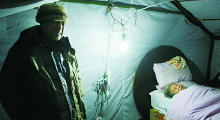昨晚7点,记者再次来到包河区国防科工办家属宿舍区,一入巷口,记者就看到帐篷的纱窗中透出了微弱灯光。走进帐篷,戴振菊正躺在一张床上。“小王来了啊!”戴振菊老两口跟记者打着招呼。