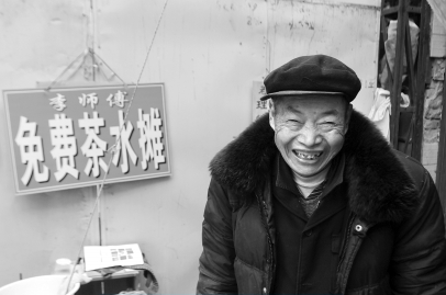 “小伙子,喝点开水吧,不要钱,管饱。”他一边指着地上的暖水瓶,一边指着墙角处写有“免费茶水摊”的牌子,朝被冻得瑟瑟发抖的记者说。刚飘过雪花的天空还阴沉着脸,可听到这样的话,立马让人心里暖暖的。