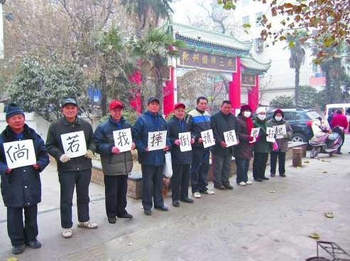 昨天上午11时,在郑州市建设西路国棉三厂大门处,十位老人在寒风中手举牌子,牌子上面写着“倘若我摔倒请将我扶起”,吸引了众多市民的围观。